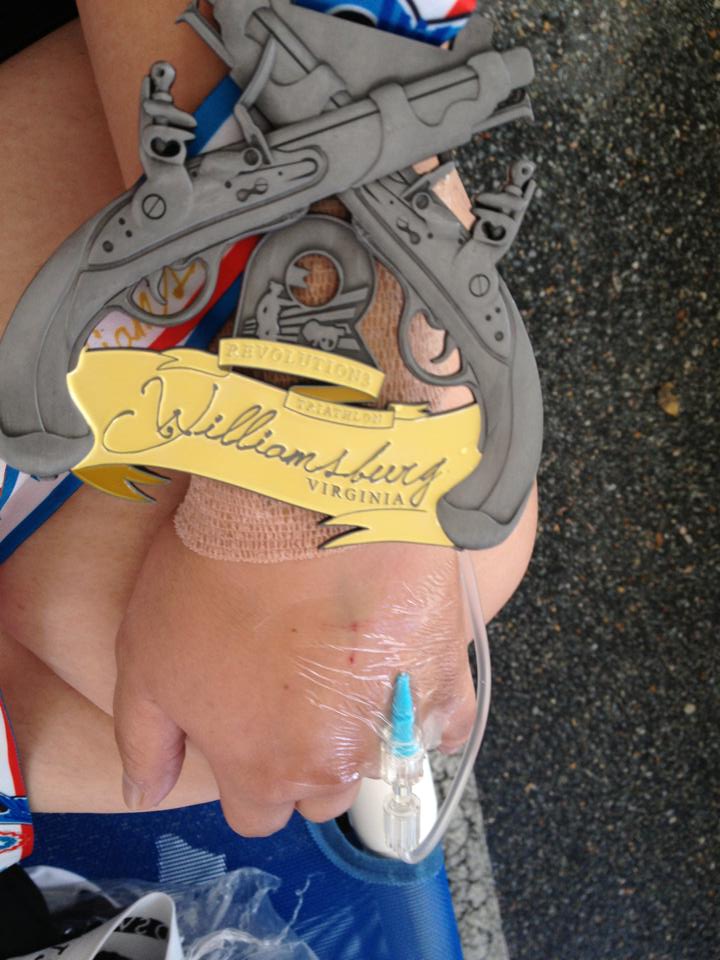 I FINISHED!! I was handed my medal. I said “Medical. Hot!” The next person asked my size for my finisher’s shirt. I said “Medical. Hot!” He gave me my shirt. The next lady offered me water. I said “Medical. Hot!” She pointed me to a woman in a red shirt; I said to her I said “Medical. Hot!” She said “Sit in my wheelchair!” and rolled me into the medical tent. I don’t remember everything of what happened for the next few minutes (nor do I want to share some that I do). I am not sure how I got on the gurney, but I do know that I was told if my temp was over 102 I was going in the ice. I heard the nurse tell the EMTs 102 and they started taking everything on me that was not my shirt and shorts off and putting it in a bag. I next remember standing in the water having them encourage me to sit down and me saying “Cold”. I found out later that I kept repeating “Hot. Hot.” any time they asked me anything when I first got there and my temp was 102.5 when they took it. They proceeded to try and get an IV started. It took 4 tries. I am normally an easy stick. Not this time. I was in the medical tent the longest of the legs at 2.5 hours and received 2 bags of fluid and 2 bottles of water. No one would let me leave till I needed the restroom. I left the medical tent with a temp of 98.4 and a huge purple bruise.